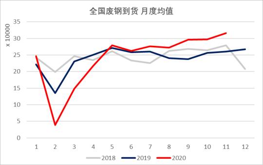 图20:全国废钢到货月度均值
