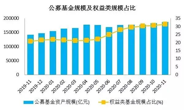 权益类基金是2020年公募市场的主角。中国证券投资基金业协会数据显示,今年前11月新增的4万亿规模中,权益类基金就多达2.7万亿,占比达67.6%。截至11月底,权益类基金总规模已经达到5.88万亿元,在公募基金总规模中占比31.37%,比去年底占比大幅提升近10个百分点。