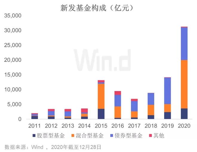 值得关注的是,权益类基金大发展。2020年股票型和混合型基金合计募集2万亿元,超过2016至2019四年之和。