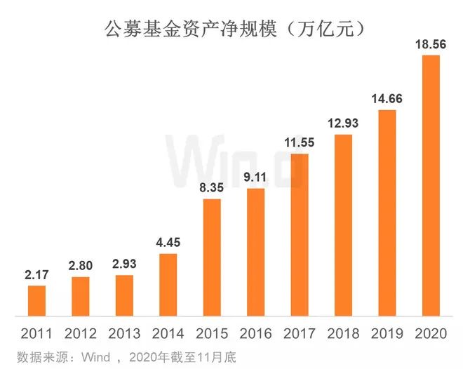 截至11月底,公募基金资产净规模已上升至18.56万亿元,较2019年底增加近4万亿元,规模上升26.5%。
