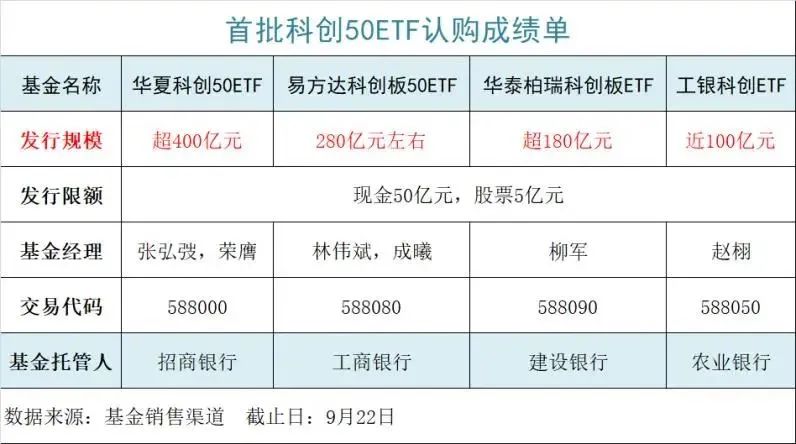 9月22日,华夏、易方达、华泰柏瑞、工银瑞信等四家公募旗下科创50ETF正式发行,首日开售即快速募集告罄,并启动比例配售。