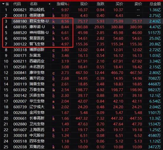 不只是国药系,疫苗股今天上午也“红旗招展”。君实生物、康希诺都涨逾8%,智飞生物涨近5%。