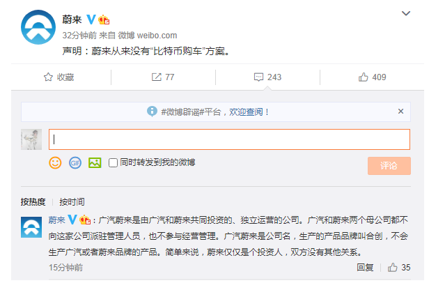 此外,蔚来发布声明称,蔚来从来没有“比特币购车”方案。