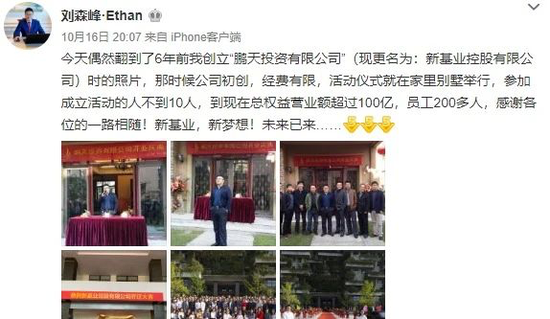 值得一提的是,早在两个多月前的10月16日,刘森峰就曾在社交媒体上宣传自己的个人公司——新基业控股。