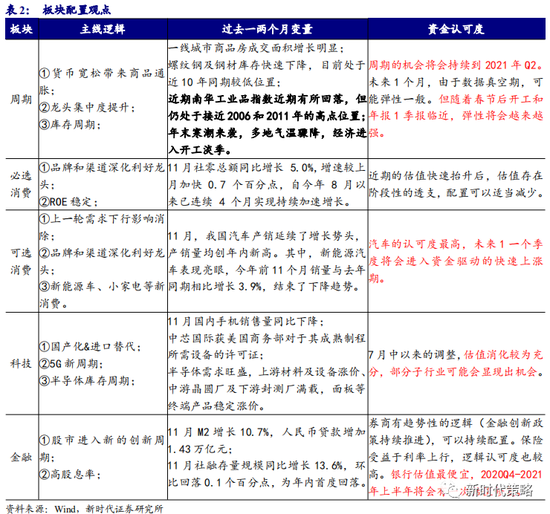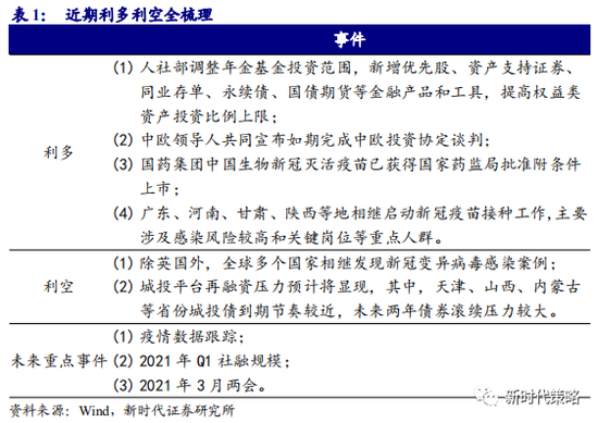 行业配置建议:未来1个季度,市场上涨的主要驱动力将由之前的盈利预期改善,阶段性变为增量资金,板块表现也会随之有所变化,大部分板块都将有绝对收益。成长股的估值调整已经比较充分,存在估值修复的可能,特别是增量资金进来的初期。2021年基本面预期最高的新能源车和军工,将会继续吸引增量资金,近期可能依然是最强的方向。周期金融前期的表现比我们预期的弱,背后主要原因不是基本面,而是投资者认识和学习的惯性转变比较慢。未来半年周期金融依然建议超配,很有可能越来越强,特别是春节后开工和年报季报披露期。重点关注汽车、军工、有色、化工、券商、银行。