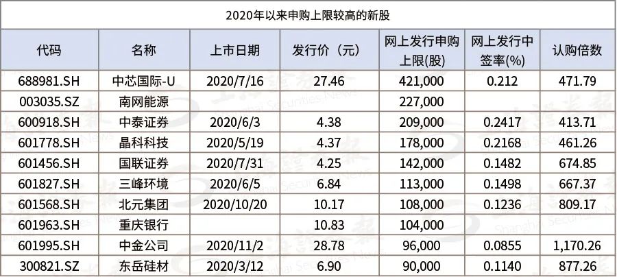 南网能源本次网上发行的申购上限高达22.7万股。一般而言,申购上限较高的个股中签率也高于一般个股。Wind数据显示,2020年以来已上市的次新股中,仅中芯国际、中泰证券的申购上限高于20万股,二者的网上发行中签率均高于0.2%,而2020年全部新股的中签率均值仅为0.0337%。