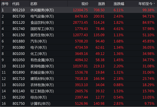 2020年,申万一级28个行业中有21个行业取得上涨,机构重仓的休闲服务、电气设备、食品饮料行业涨幅居前,分别上涨99.38%、94.71%、84.97%。