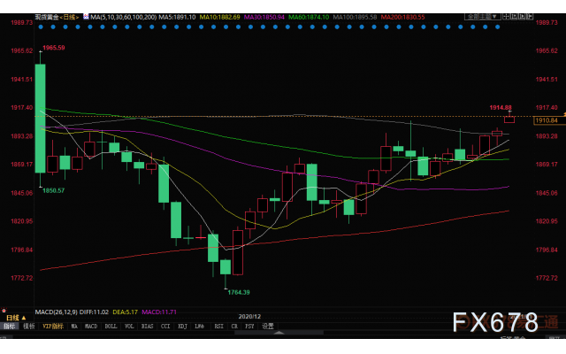 尽管黄金市场在2020年的最后一个交易日几番挣扎仍未能突破1900美元大关,但黄金的反弹还没有结束,因为在新年来临之前,散户投资者的情绪仍然非常乐观,超过九成投资者看多。而各大银行机构同样预测2021年通胀压力上升,黄金会继续上涨。进入到2021年第一个交易日,金价跃升,开盘即顶破1900关口,最高触及达到1914.88美元/盎司。