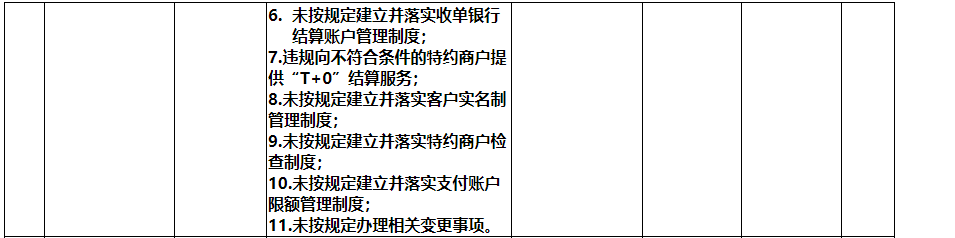 违法行为类型包括:未按规定履行客户身份识别义务;与身份不明的客户进行交易;未按规定报送大额交易报告或者可疑交易报告;允许外包服务机构以特约商户名义入网并接收其发送的银行卡交易信息;未按真实交易场景、准确标识并完整发送、保存交易信息,确保交易信息真实、完整、可追溯和在支付全流程中的一致性;未按规定建立并落实收单银行结算账户管理制度;.违规向不符合条件的特约商户提供“T+0”结算服务;未按规定建立并落实客户实名制管理制度;未按规定建立并落实特约商户检查制度;未按规定建立并落实支付账户限额管理制度;未按规定办理相关变更事项。