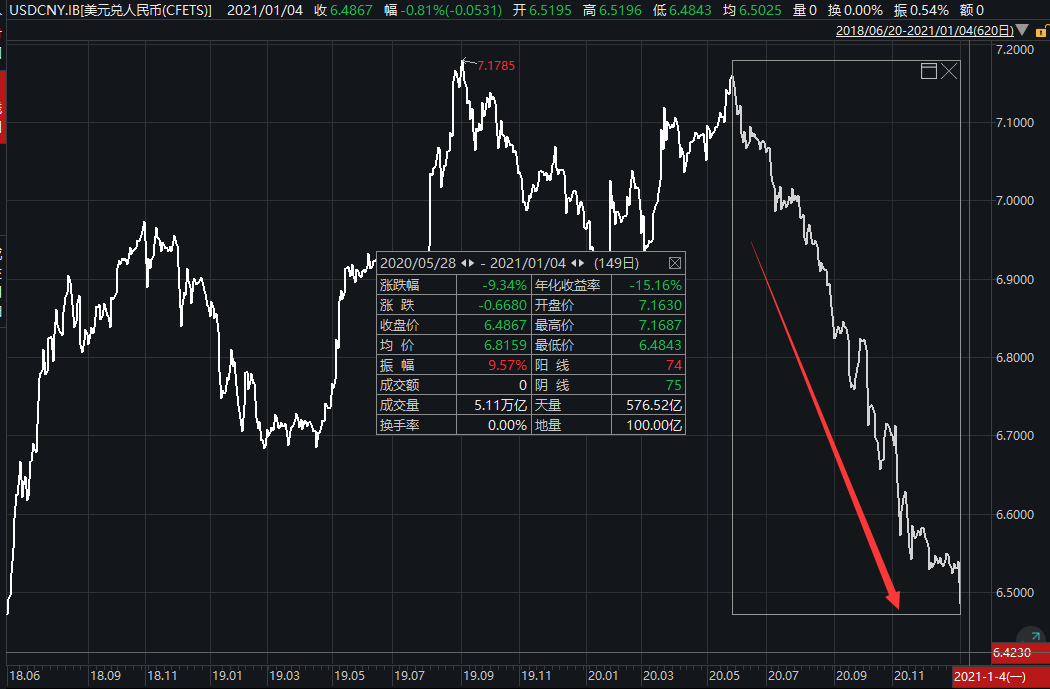 1月4日早间,人民币对美元即期汇率1月4日以6.5195开盘,随后接连升破6.51和6.50关口,日内涨幅超650点,并创下2018年6月22日以来新高。