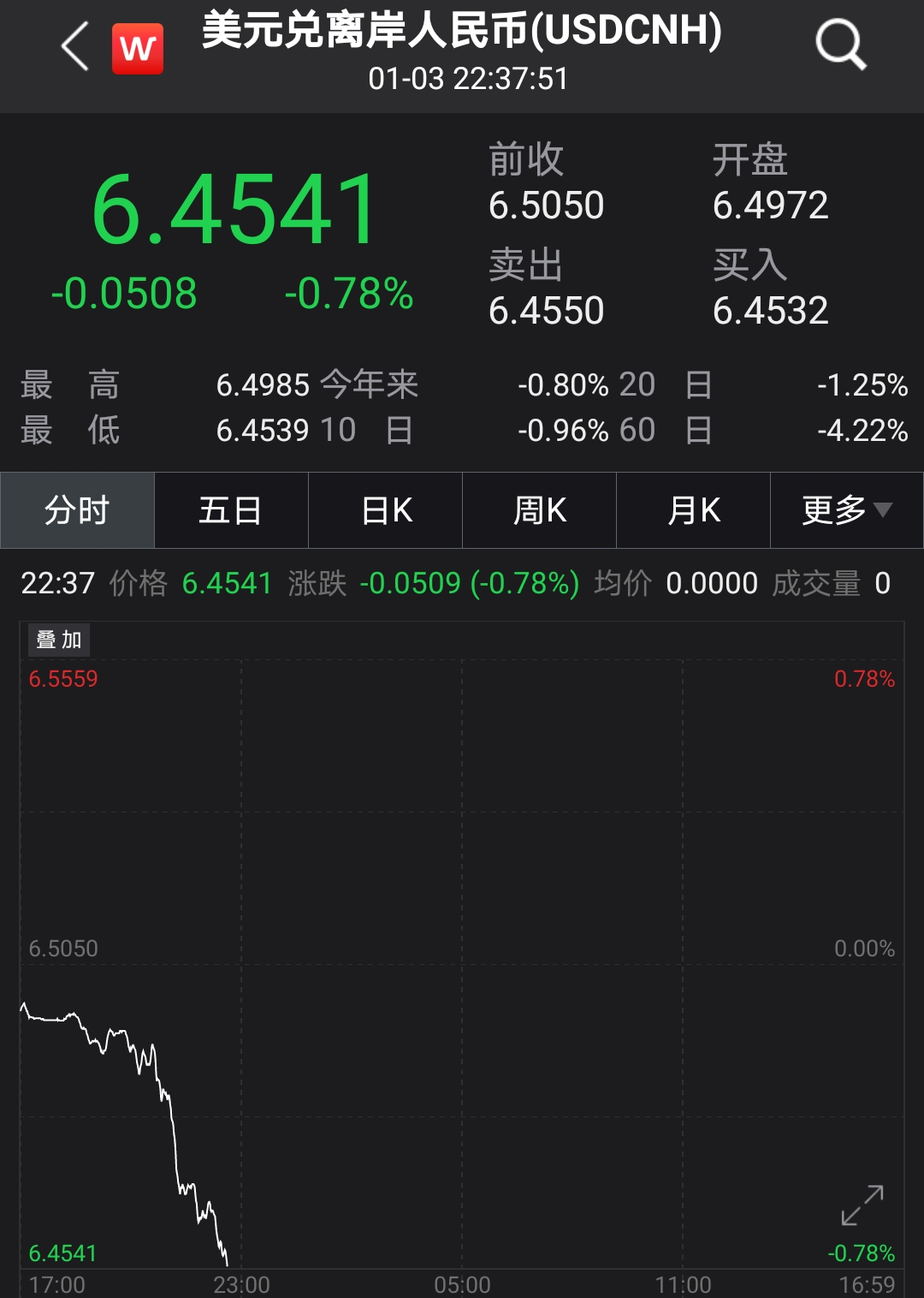 而离岸人民币对美元汇率涨幅则更大。1月4日,离岸人民币对美元汇率接连升破6.49、6.48、6.47关口,最高升值至6.4541,日内升值超过500个基点。