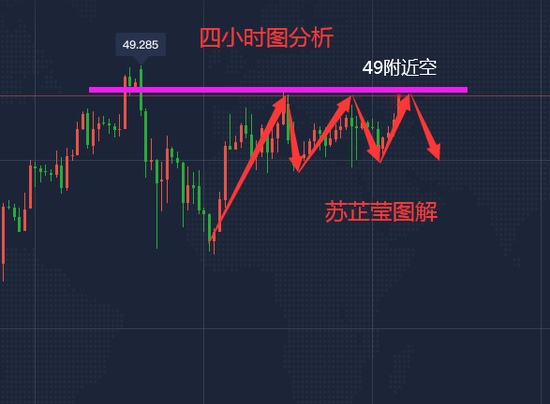原油自跳空低开后行情便一直维持区间内震荡,今日早盘原油再次上涨,但是依旧没有突破当前的压力,所以早盘先空。原油几次冲高均未突破49一线压力,上方缺口阻力以及前高位置的压力依旧明显,直接突破的可能不大,今日原油操作苏芷莹建议高空为主。