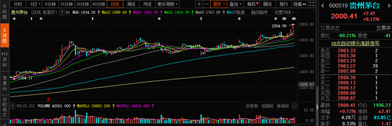 值得注意的是,股王贵州茅台今日盘中正式升破2000元整数关口,股价再创历史新高。