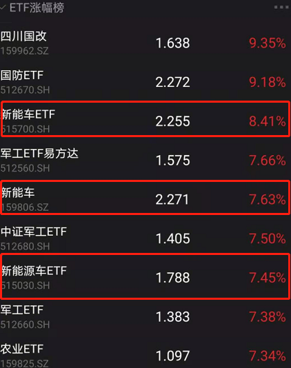 除此之外,新能源车ETF、新能车等相关ETF基金涨超7%以上。