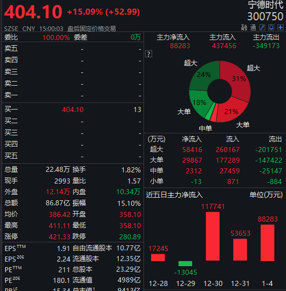 从概念个股看,电池巨头宁德时代无疑成为当天的暴涨明星,1月4日当天,宁德时代频频冲上新高,股价站上400元高位,一度大涨超17%以上。