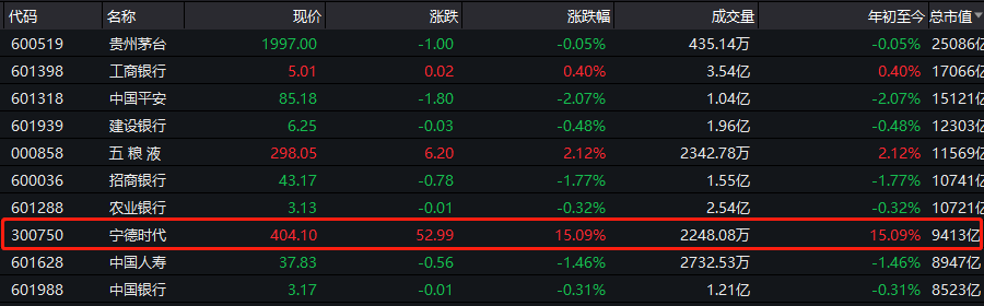 截至今日收盘,宁德时代上涨超15%,市值达9413亿元,市值超过中国人寿,位居A股第八位。