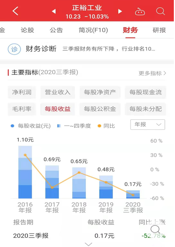 2016年每股收益1.10元,2017年同比下滑37.27%,2018年同比下滑5.8%,2019年同比下滑26.15%,2020年前三季度同比下滑52.78%。