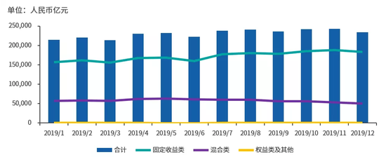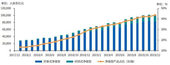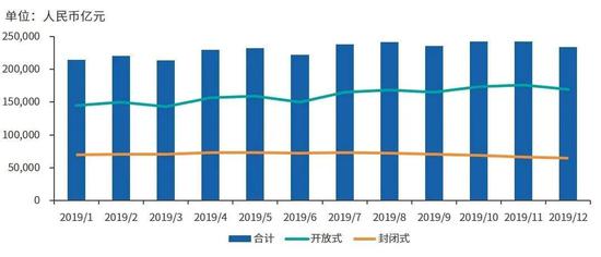 按照运作模式来看,开放式理财产品规模最大,2019年末占比为72.36%,封闭式理财产品占比为27.64%。由于资管新规对开放式产品使用摊余成本计量的条件较高,且开放式产品运作很难满足新金融工具准则的业务模式规定,因此需要重点关注开放式产品的净值计量。