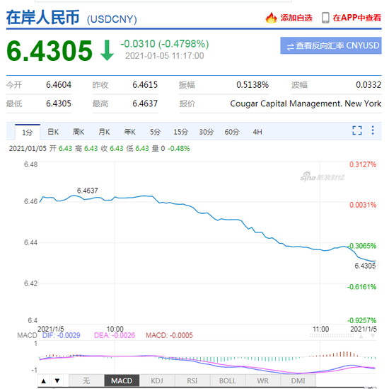 1月5日,离岸人民币升破6.41关口,日内涨超400点。