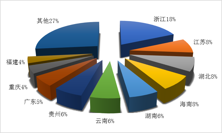 与此同时,第三季度旅行社国内旅游接待人次排名前十位的地区由高到低依次为浙江、江苏、湖北、海南、湖南、云南、贵州、广东、重庆和福建。
