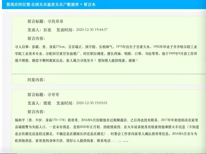“身份信息未知的无名逝者背后,是很多忐忑不安的家庭。他们找了很多年人,就会往坏处想,会来这个网站找‘人’。”张大勇能想象这种苦痛,他希望数据库能给有需要的家庭提供线索,帮助生者寻亲,也让逝者早日入土为安。网站的另一端,则是留言寻找失散的亲人,“生要见人,死要见尸”,是他们最后的执念。