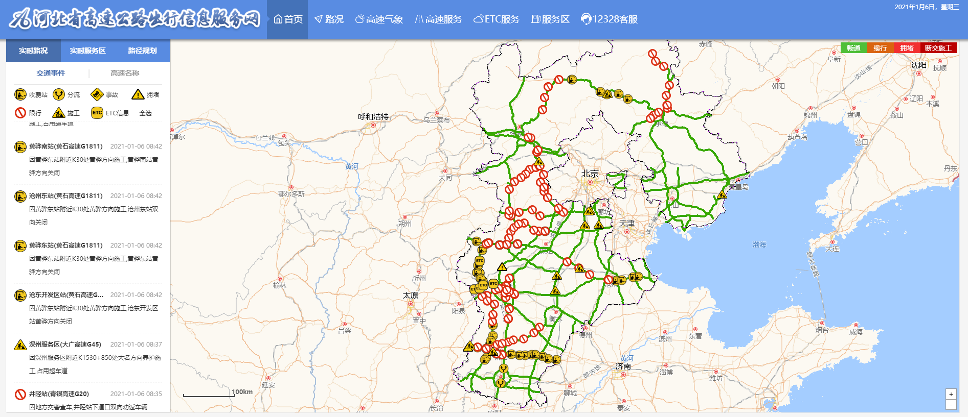 据河北高速96122官方微博1月6日早间消息,因疫情防控,河北境内10条高速禁止车辆上道、劝返车辆,多个高速站口关闭。
