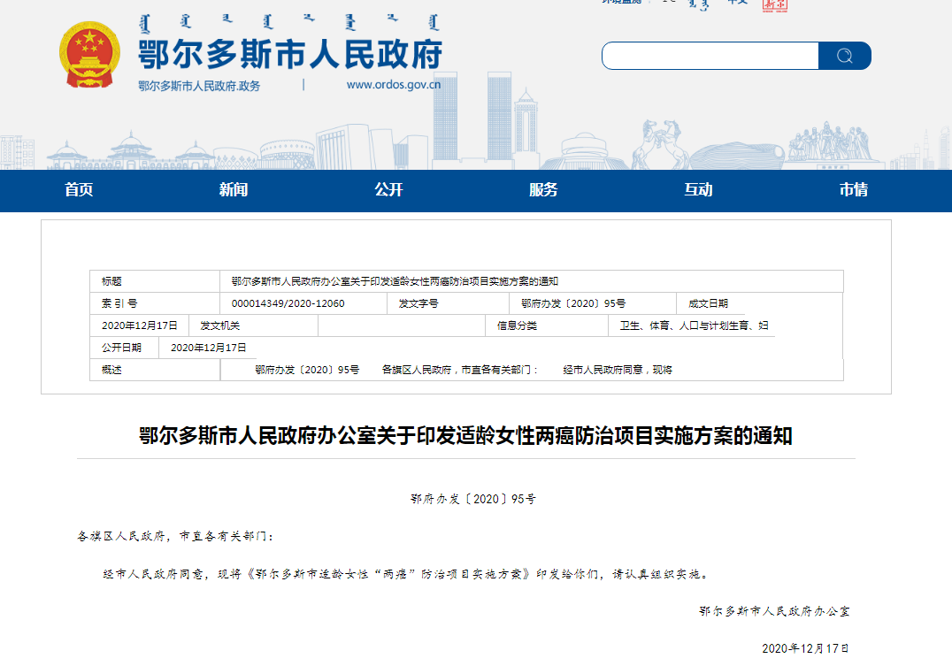 日前,鄂尔多斯市发布《关于适龄女性两癌防治项目实施方案的通知》。
