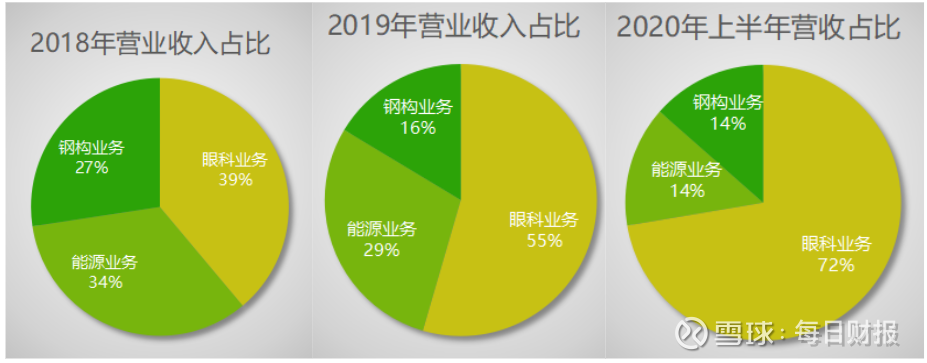 这从业绩报表中也能清楚直观地发现。《每日财报》注意到,光正眼科的营业收入由眼科、能源、钢构三部分组成,钢构业务从2018年的3.17亿元营收,占比26.95%;到2019年的1.31亿元,占16.39%;再降到2020年半年报的4248.3万元,占13.63%。能源业务从2018年的3.9亿元,占33.2%,到2019年的2.33亿元,占29.15%,再降到2020年半年报的4399万元,占13.1%。