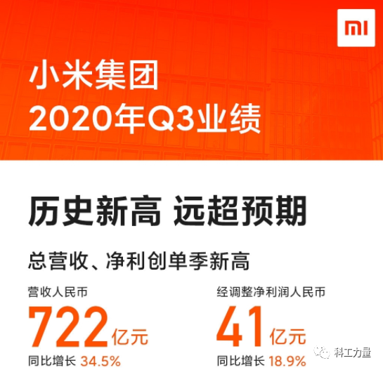 根据小米发布的财报,2020年Q3小米总营收722亿元,同比大幅增长34.5%。经调整净利润41亿元,同比增长18.9%。总营收和净利润都创单季新高。