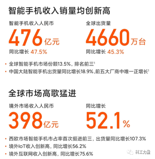 其中,小米智能手机收入476亿元,同比增长47.5%;IoT与生活消费产品收入181亿元,同比增长16.1%;互联网服务收入58亿元,同比增长8.7%;广告收入33亿元,同比增长13.7%。