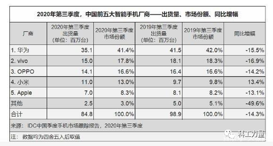 根据IDC的数据,2020年Q3华为在中国市场出货3510万台,首次同比大跌15.5%。而小米依然“一枝独秀”,同期出货1100万台,并取得唯一的13.4%正增长。