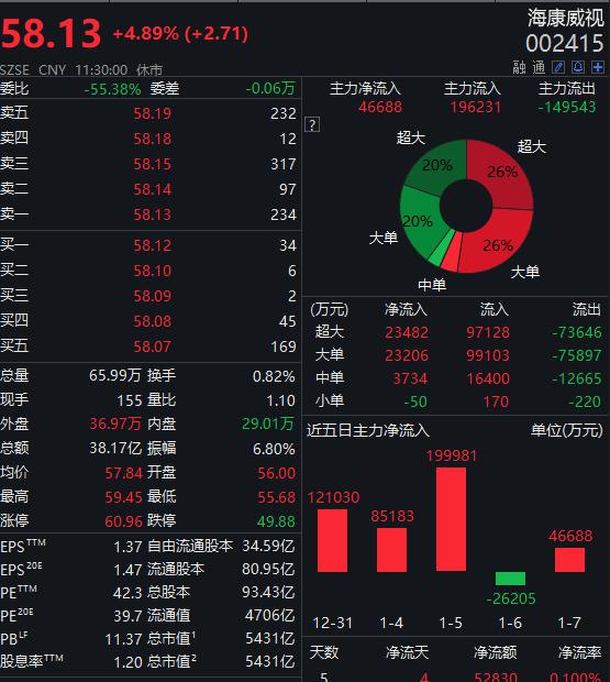 截至7日午盘收盘,海康威视涨4.89%,市值高达5431亿元,盘中刷出股价历史新高位置。