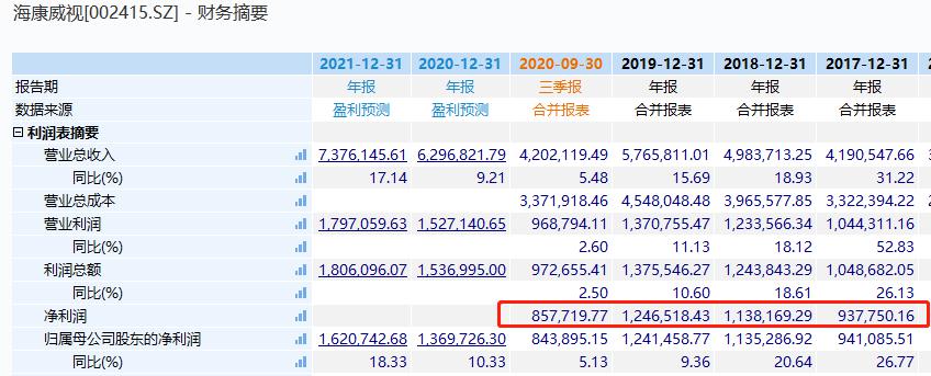 数据显示,2017年-2019年的净利润同比增速分别为26.77%、20.63%和9.36%。去年前三季度,在疫情冲击及外围环境变化的影响下,海康威视的净利润依然达到了84.39亿元,同比增长5.13%。