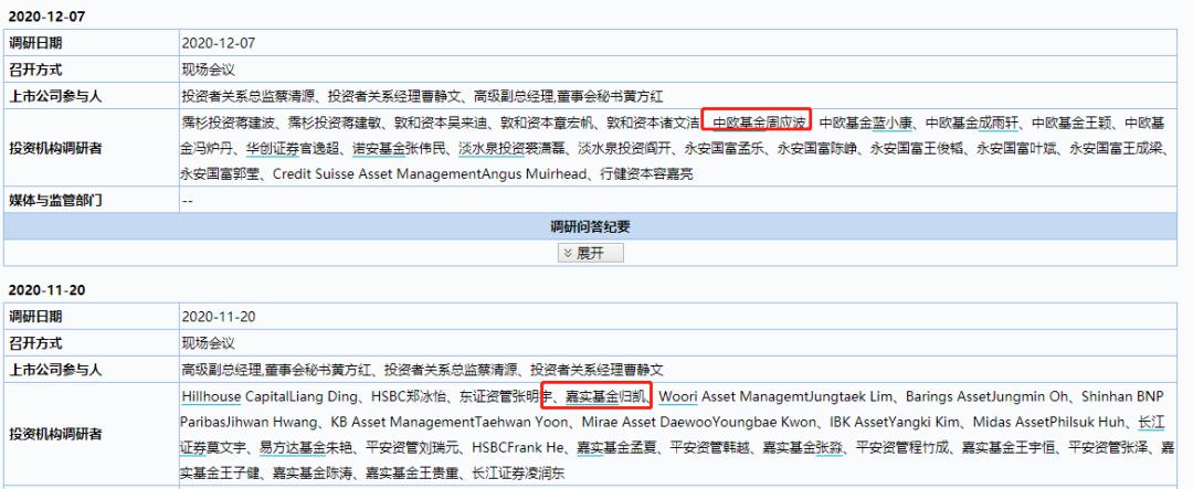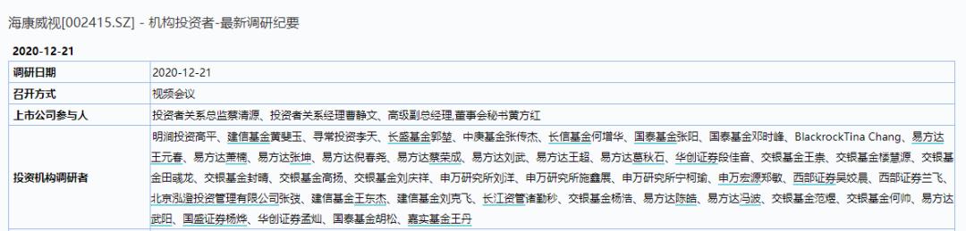 据公司调研记录显示,2020年12月21日,海康威视组织投资者机构调研的视频会议,其中参与的机构不乏易方达张坤、萧楠、交银基金王崇等基金经理的参与。