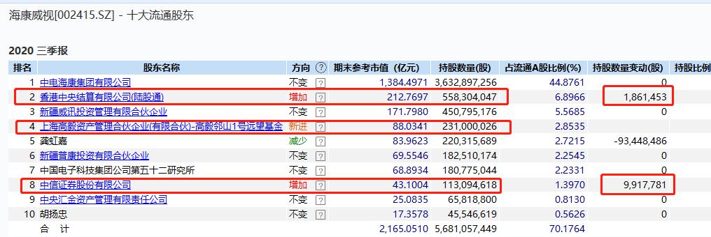 从目前海康威视的十大流通股名单来看,高毅资产持股比例达到2.85%,位居流通股第四大股东。除了高毅资产之外,海外资金也通过陆股通方式增持了海康威视,同时中信证券为代表的券商也在去年三季度之际新增了海康威视的仓位。