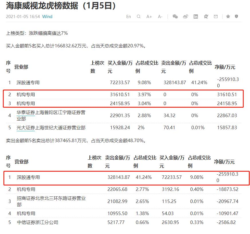 令人关注的是, 以外资为代表的北上资金却早在2018年开始就频频减持海康威视。开年前两个交易日,海康威视放量大涨,但深股通席位却大举抛售。相比公司股价走势来看,北上资金的疯狂甩卖却成为了“反向指标”。