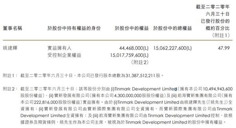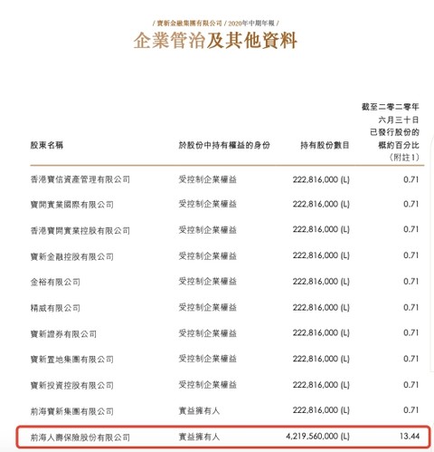 业内熟知的是,曾经的中国金洋(现已更名为“宝新金融集团有限公司”)是姚建辉的资本运作平台。宝新金融2020年半年显示,姚建辉为该公司的实际控制人,通过个人及其控制的实体Tinmark Development Limited合计持有47.99%的股权;此外,宝能系旗下的前海人寿也现身宝新金融的主要股东,持有宝新金融42.2亿股好仓,占已发行股份的13.44%。