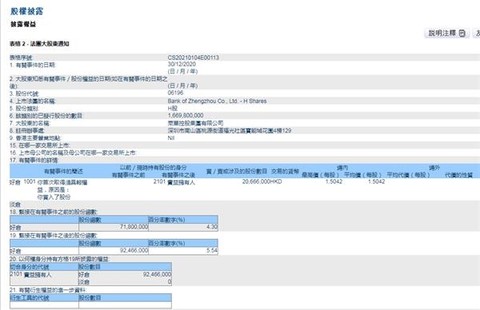 港交所的股权变更披露公告显示,莱华控股集团有限公司(简称“莱华控股”)以1.5042港元的每股平均价格,在近日买入郑州银行H股2066.6万股。