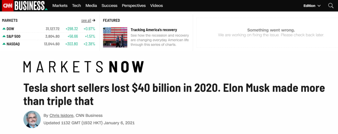 据CNN、彭博社的外媒援引金融数据公司S3 Partners的分析显示,2020年特斯拉股价上涨743%,让空头们损失高达401亿美元。