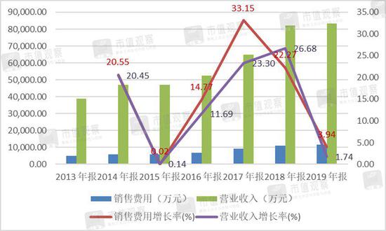 从图中可以看出,公司营业收入增长的幅度大小与销售费用的投入密切相关。例如2018年销售费用同比增长22.27%,营业收入同比增长26.68%;而在2019年销售费用增长率为3.94%的情况下,营业收入增长率仅为1.73%。在公司极度重视销售的情况下,其研发投入却不及其他公司。这样高度依赖营销驱动业绩增长的模式,在行业竞争中是难见优势的。