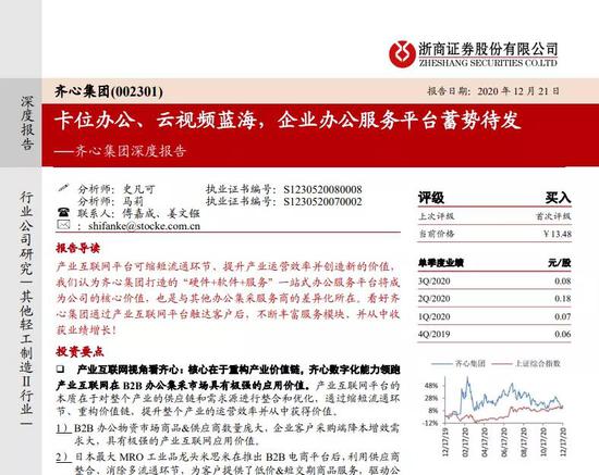 浙商证券分析师史凡可(金麒麟分析师)、马莉(金麒麟分析师)去年12月21日在题为《齐心集团深度报告:卡位办公、云视频蓝海,企业办公服务平台蓄势待发》的研报中表示,预计2020~2022年公司实现营收84.24/118.21/166.28亿,同增40.83%/40.33%/40.67%;归母净利3.00/4.14/5.89亿,同增30.46%/37.7%/42.36%。当前股价对应PE分别为
