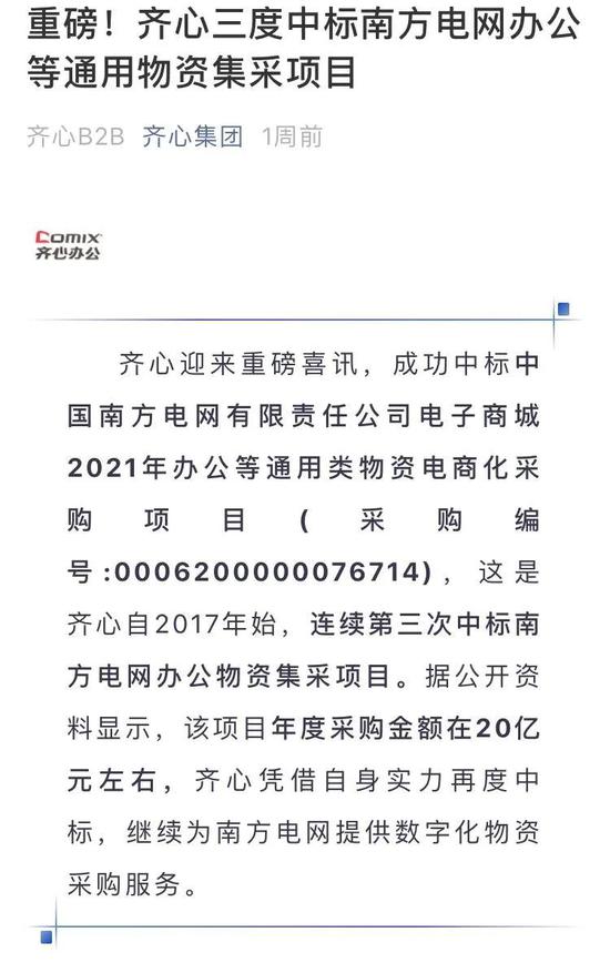 据齐心集团官方公众号今年1月1日消息,公司成功中标南方电网电子商城2021年办公等通用类物资电商化采购项目,该项目年度总采购金额将在20亿元左右。齐心集团自2017年起,已连续第三次中标南方电网办公物资集采项目。