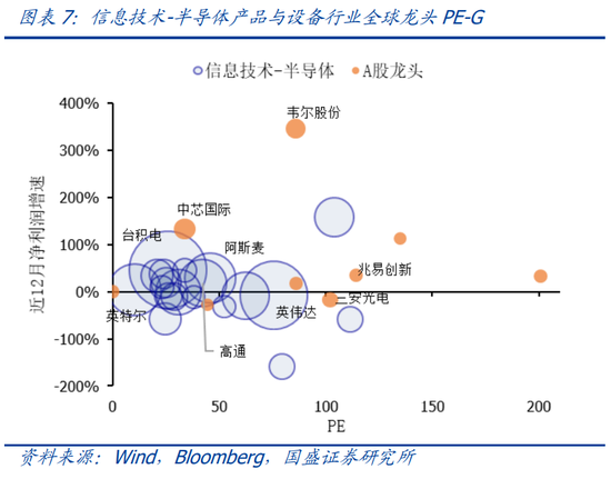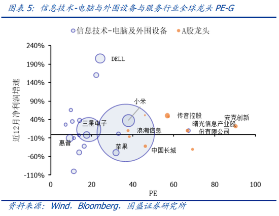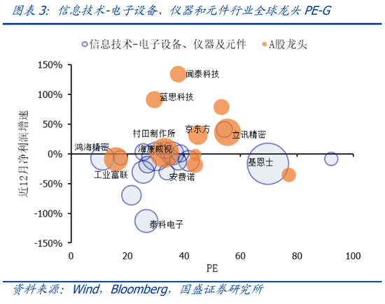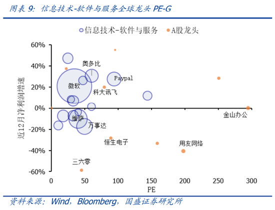 2、与海外龙头相比,当前A股大部分科技行业PE估值多为偏高、业绩增速中等或较低,PE-G框架下多处于偏贵或合理。