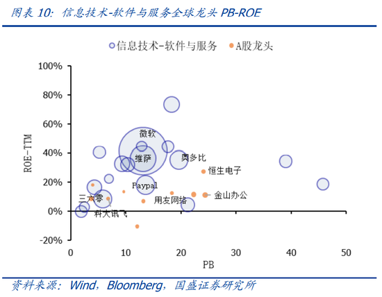 3)PE-G或PB-ROE下偏贵的行业有:软件与服务、通信设备、电脑与外围设备;