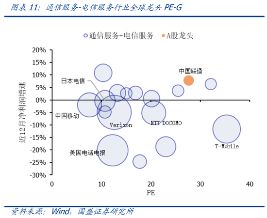 PE-G角度:A股龙头中国联通PE较高,业绩增速也相对较高,PE-G下更具优势。