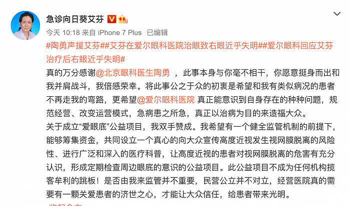原标题:陶勇医生微博声援艾芬:呼吁加强白内障术前检查