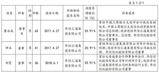 董永成则现年已经64岁,曾任中国工商银行大连市分行技改处副处长,中国工商银行大连信托投资股份有限公司总经理,现任华信汇通集团有限公司董事长、总经理,华信信托董事长。