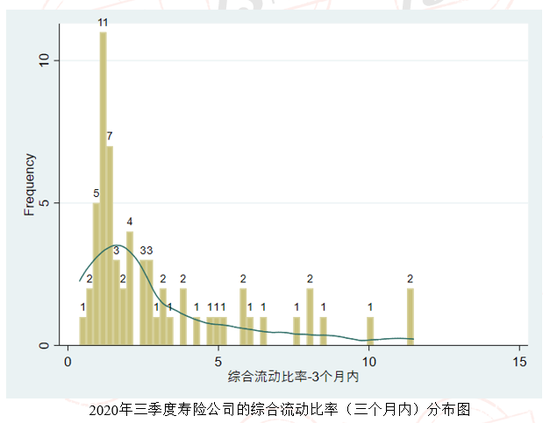 需要指出的是,中邮人寿、太平人寿、中美联泰和中英人寿,综合流动比率均为负值。有些公司给出了解释,由于考虑续期保费收入,准备金项下的预测为现金流入,导致3个月内、一年内的测算结果为负值,表明公司不需要变卖现有资产,公司通过业务现金流入即可满足各项现金流出的需要。如此来看,由于负债端的净流入导致综合流动比率为负,可能是公司流动性测度的利好情况。考虑到综合流动比率指标的可比性,我们剔除了这四家公司。