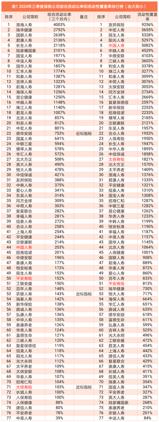 从综合流动比率来看,渤海人寿的综合流动比率达到了4003%,是所有公司中最高的;中国人寿是203%,排44名;平安寿险为152%、排名第50;太保寿险103%,排名第71;