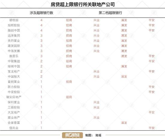 根据汇总结果,碧桂园(02007.HK)、旭辉控股(00884.HK)和融创中国(01918.HK)涉及了所有4家超限的第二档上市银行,远洋集团(03377.HK)、美的置业(03990.HK)、建发国际(01908.HK)、中海发展(00688.HK)、雅居乐(03383.HK)则涉及了其中3家超限银行。